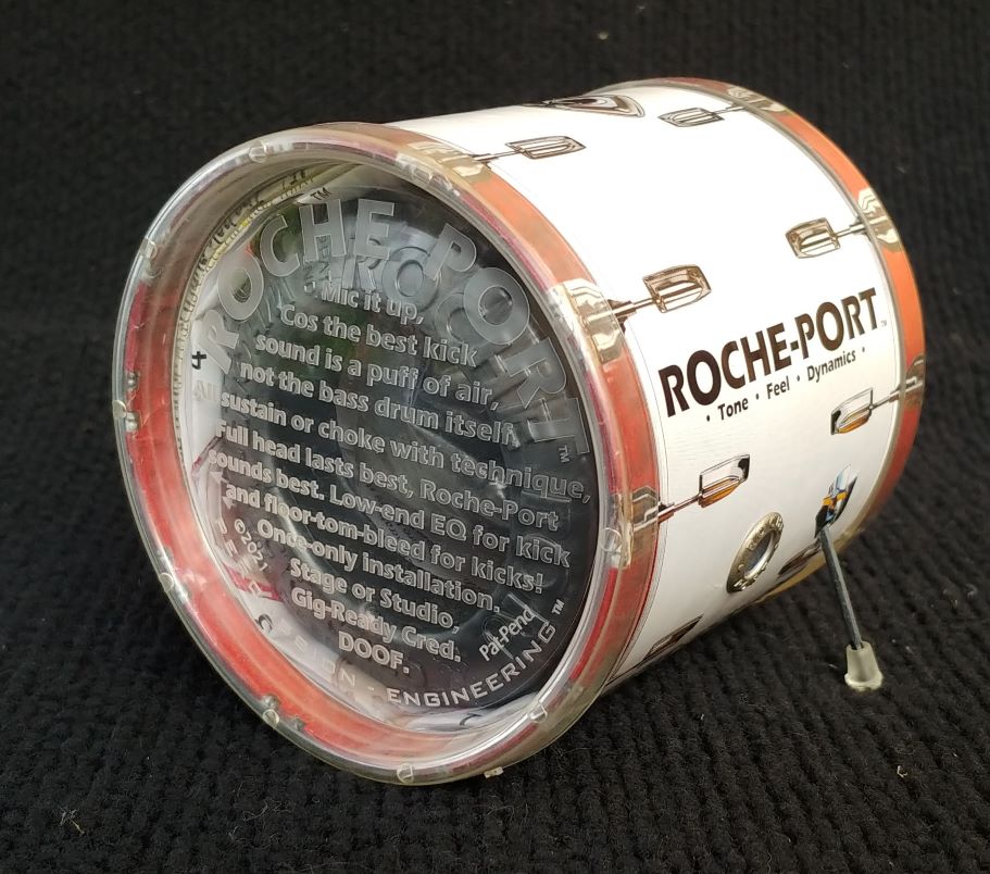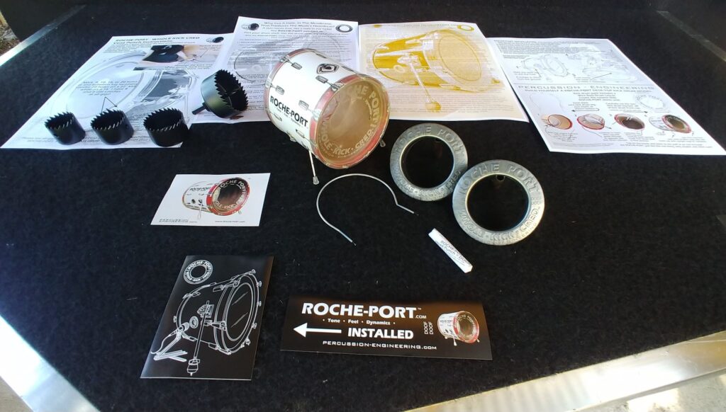 Below is the ROCHE-PORT Ported Bass Drum Pack, including the tools, the Present-Day Use and Benefits Chart, Instructions and a History Page of ‘bass drum sound-pursuit’ with video links to the journey! Two ROCHE-PORTS, a kick skin vent punch and three stickers to promo the privileged position your new sound will perform. A lifetime of solutions for a cost, similar to that of a new bass drum skin! Never needing to cut a hole in or ruin a new skin again!